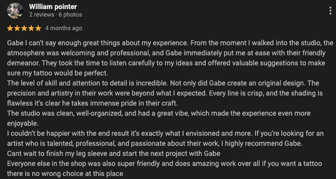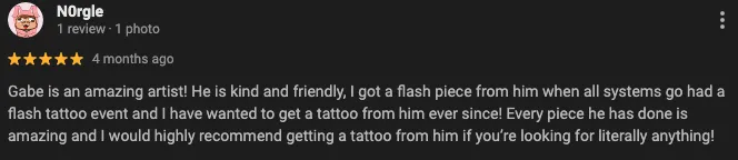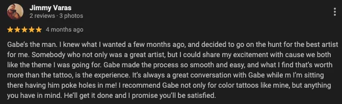 Tattoos can range in price, with the main thing being how big the piece is. Once you submit your idea you'll receive an instant quote on your tattoo idea. I won’t ghost you. You’ll hear back from me fast. I always respond!